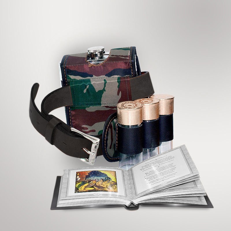 Отличный бизнес-подарок, простой и в то же время очень необычный. В нём 5 предметов - и все незаменимые. И на охоте, и не только. Ремень в наборе - не только для того чтобы носить подсумки и "дичь". И патроны - тоже не просто сувенир. Всё очень полезно и практично. А ещё книга "Тосты" - компактная, но при этом цветная, на мелованной бумаге, отличный подарочный экземпляр. В ней всё, что необходимо для того, чтобы расцветить любой незамысловатый тост - стихи, афоризмы, цитаты. Эти дополнения сделают речь любого тостующего - выступлением опытного тамады. А ещё в наборе стильная стальная фляжка.