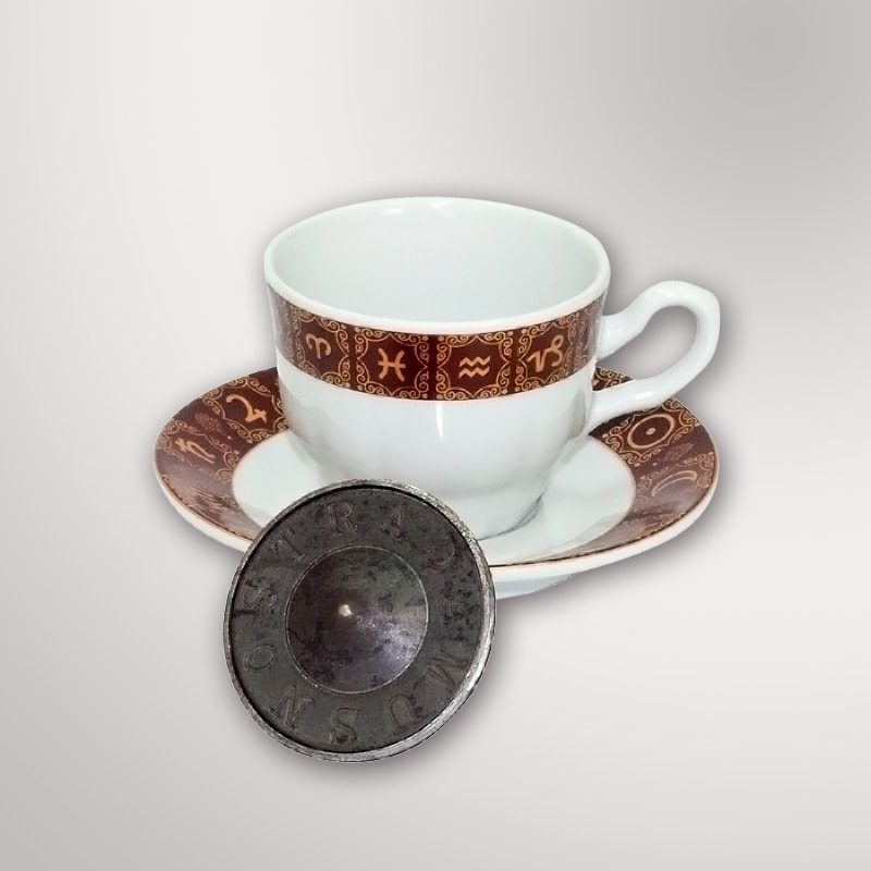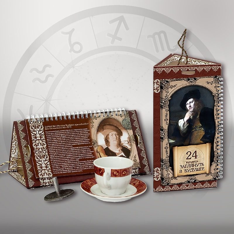 Но это ещё не всё. На обороте каждой страницы — техника предсказаний, 24 способа заглянуть в будущее. Помогут в этом два вложения, которые составляют основу подарочного набора. Это чайная пара, аналогичная той, что была подарена Нострадамусом Екатерине Медичи, и его не менее знаменитый волчок, с помощью которого великий прорицатель нагадал будущее Генриху IX.